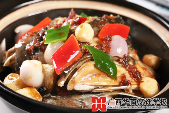 3、取煲仔上火,放少许的油烧热后,下干葱块、蒜头炒香,在放鱼头的同时,淋适量的鲍鱼汁并撒香葱段和小米椒节,等到加盖小火焗3分钟至香味浓郁时,方可离火上桌。