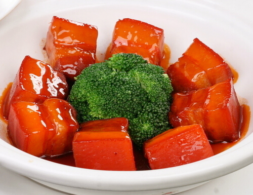 5、焖肉的时候,将西兰花掰成小朵、洗干净后入锅焯熟,捞出沥干水后摆盘;