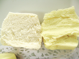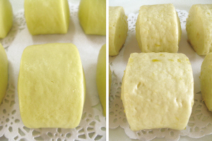 左为天然香芋包,右为加了香芋色香油的香芋包,外观上差别明显。