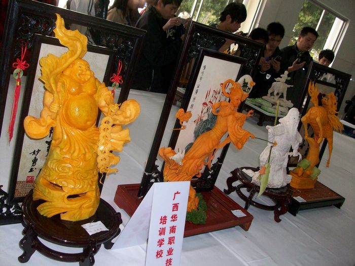 我校选派的陈富强同学以“罗汉”和“金鱼”两个作品分别获得雕刻和拼盘的二等奖荣誉。黄振兴同学以“上汤睡莲”作品获得热菜二等奖荣誉。