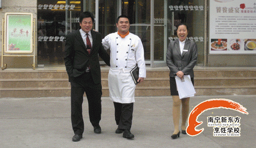 我校领导朱伟和国大酒店行政总厨李润佳、黄助理合影