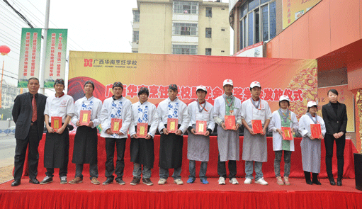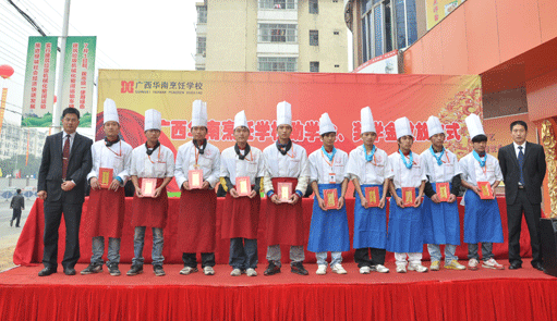 12月28日,广西华南烹饪学校首届“百家宴”暨奖学金、助学金发放仪式在大学路校区举行,校领导朱伟、魏兆权、宇翔、万家国等出席了此次活动,美容美发学校的王勇老师、海纳电脑学校的汪骐老师、考证中心胡加文老师做为嘉宾参与了此次颁奖仪式。此次颁奖仪式除了对奖学金、助学金的发放,同时还对优秀学生和在第十届西乡塘美食节上获奖的学生进行表彰。奖学金获得者共10人,每人2000元;助学金获得者为二年制全体学员,每人750元;优秀学生获得者40余人。