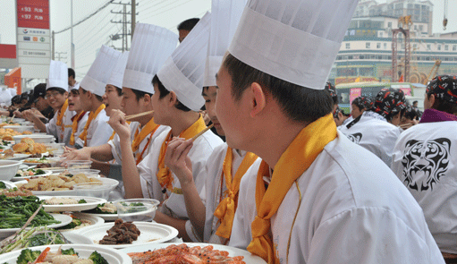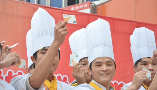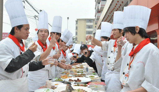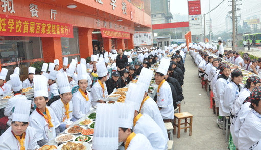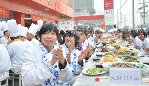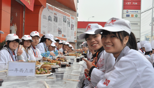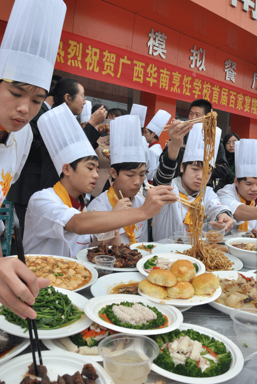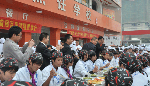 颁奖一结束,同学们就开始尽情享受首届“百家宴”成果。“百家宴”上壮观的阵容和桌面上一道道丰盛的美味,吸引了不少摄影爱好者和群众前来围观。首届“百家宴”的成功举办,不仅大大提高了我校的知名度,更是让不少人大开眼届,在我校史上也是空前的一次创新举作。参与到“百家宴”当中的每一道菜、每一道工序都是同学们亲自操作,每个班分工制作各种菜品。吃着自己烹饪出来的美味,心里有说不出的美。大家一同高举手中的杯子,共同为这个栽培了他们的学校和老师送上祝福,也为他们自己明天的成功欢呼!