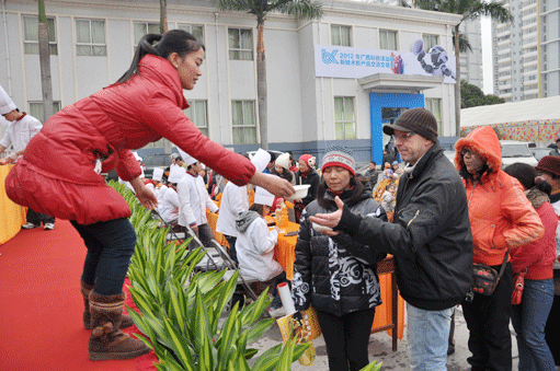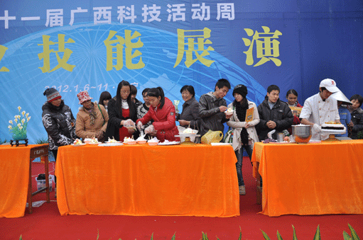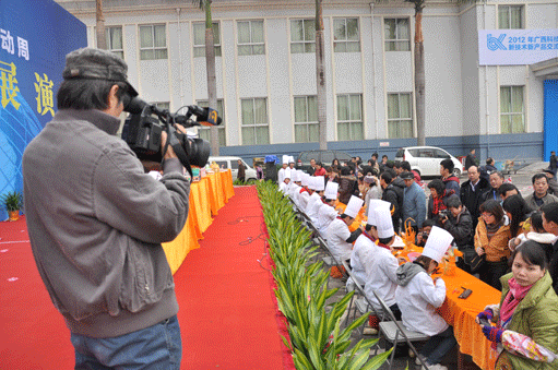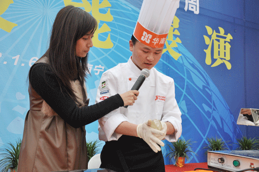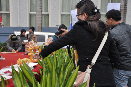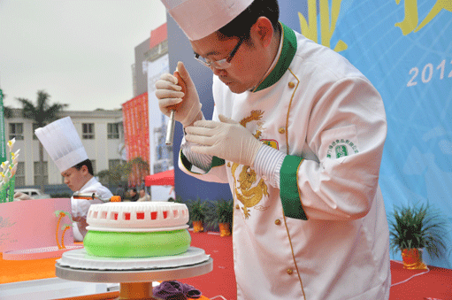 活动上,我校师生现场为观众表演了瓜果雕刻、拼盘、糖艺、蛋糕制作等,还向观众们讲解了制作的方法,当主持人宣布参与此次活动互动的观众,将有机会获得活动现场制作的蛋糕、糖艺制作品时,顿时高涨了现场的气氛,观众们纷纷拿起手中的宣传册仔细的阅读。一件件雕刻品慢慢的的打造出来,一道道美味烹制展现出来,观众都蜂拥而上,争相观看,摄影爱好者和媒体朋友们也是丝毫没有放过此时此刻精美的镜头。各种雕刻艺术品和美味佳肴,观众们不仅可以大饱眼福,而且也可以一饱口福,同时还可以学到烹饪知识,真是一举三得。