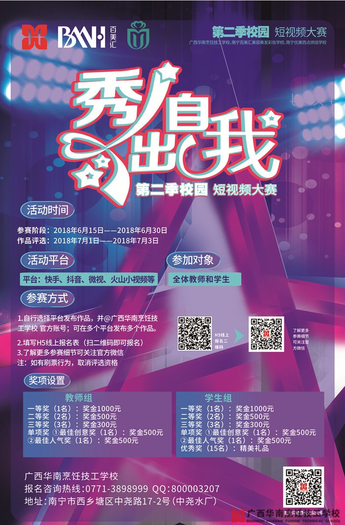 ②参赛:在提供的短视频APP平台范围中,参赛者自行选择平台发布作品,并@广西华南烹饪技工学校 官方账号。