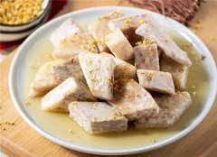 荔浦芋头 半个 淀粉 1匙 干桂花 适量 黄冰糖 1小把 麦芽糖 1匙 蜂蜜 1匙 1.芋头去皮,清洗干净。改刀切成菱形块装盘备用。 2.蒸锅大火烧开上汽,放入芋头块大火蒸制5分钟。 3.蒸制结束取出晾凉。 4.平底锅中加入一小